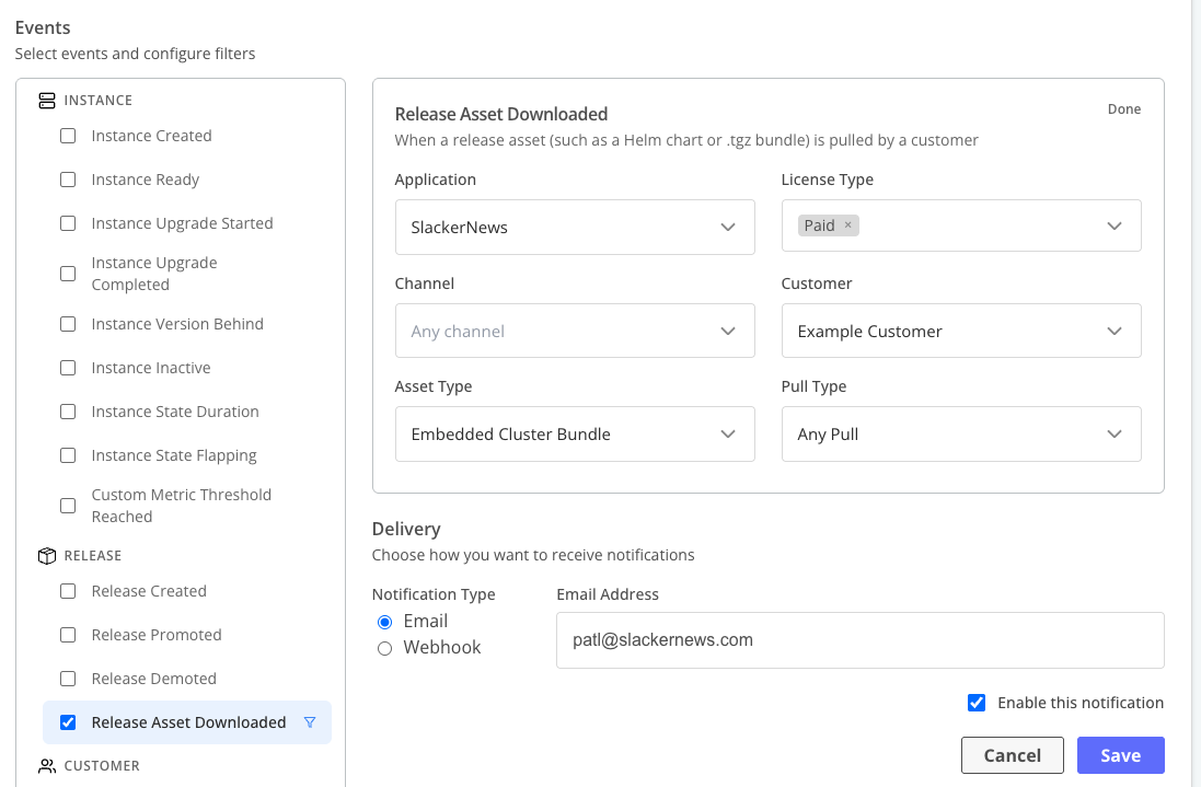 This topic describes how to create event notification subscriptions in the Replicated Vendor Portal. For more information about the Event Notifications (Beta) feature, see About event notifications (Beta).