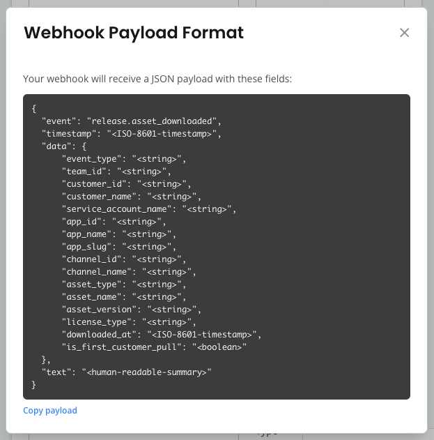 4. Click View example to open the webhook payload preview modal and see the exact JSON payload structure your endpoint receives for the selected event types. Click Copy payload to copy the format to your clipboard.